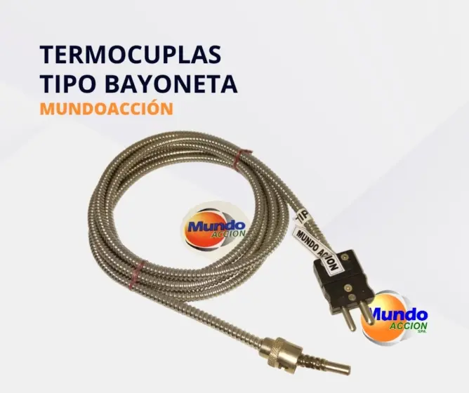 El diseño bayoneta de esta termocupla facilita el montaje rápido en superficies, compatible con tipos J y K. Es robusta y precisa para monitoreo continuo en maquinaria.