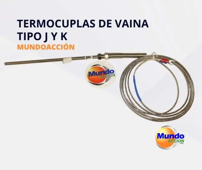 Las termocuplas de vaina tipo J y K están protegidas por una funda metálica para resistir corrosión y altas temperaturas. El tipo J es perfecto para hasta 760 °C, mientras que el K alcanza 1370 °C, ideales para procesos químicos y metalúrgicos.